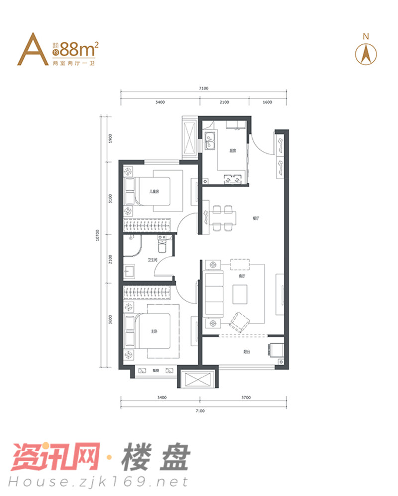 ▲建面约88㎡户型示意,两室两厅一卫,南北通透,主卧带飘窗
