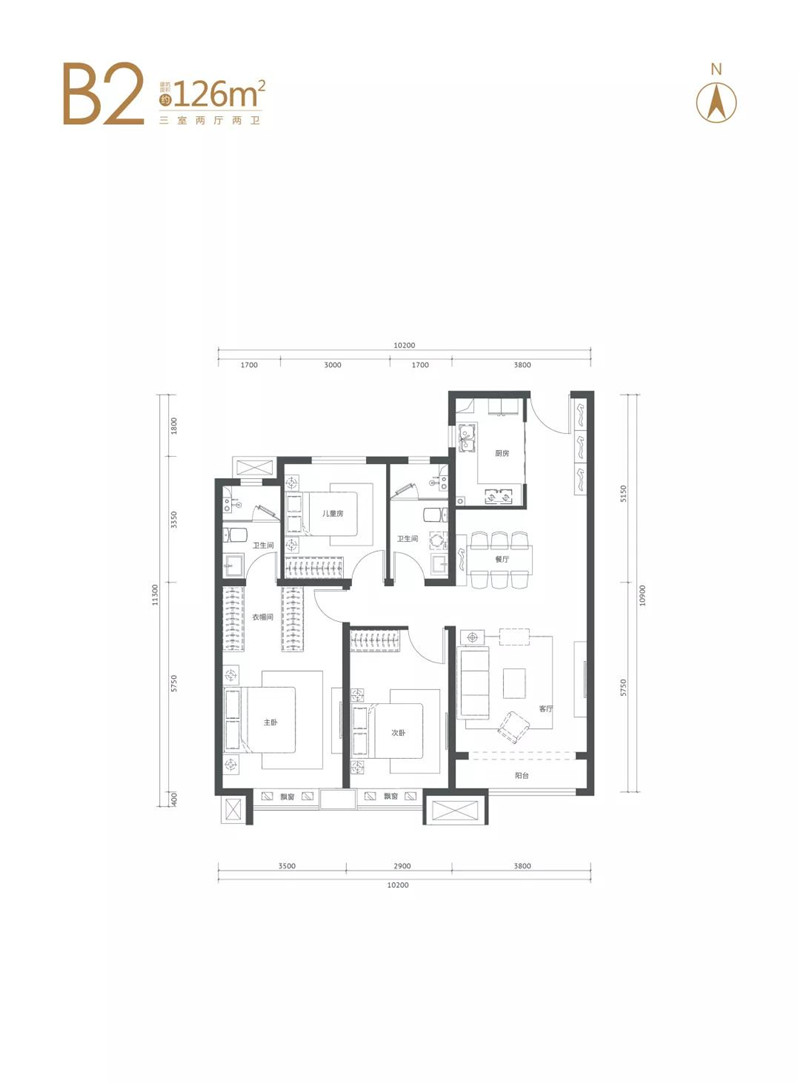 ▲建面约126㎡户型示意,三室两厅两卫,样板间户型
