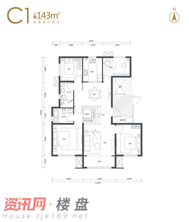 ▲建面约143㎡户型示意,四室两厅两卫