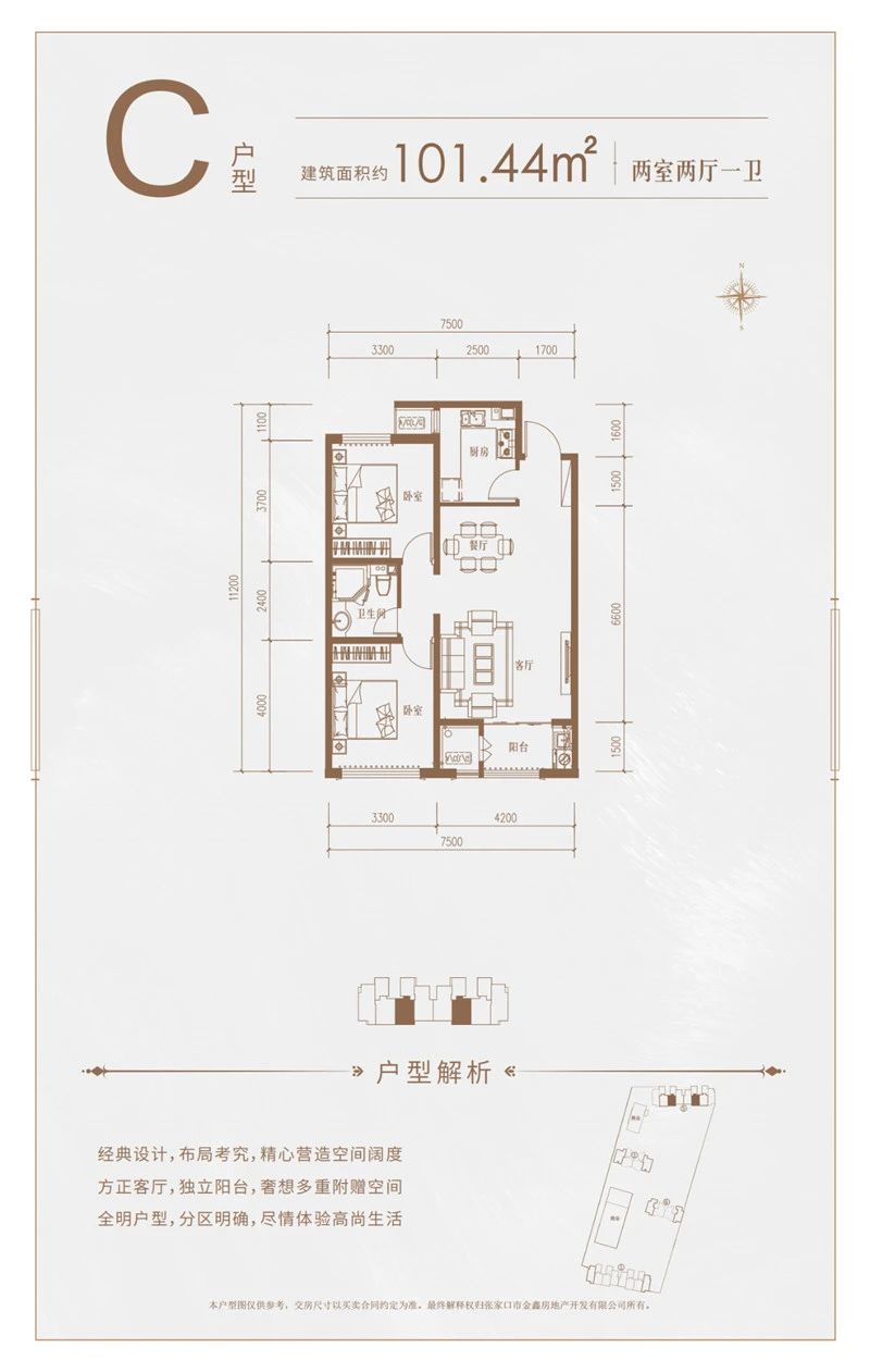 建筑面积约101.44平米两室两厅一卫户型,客卧朝阳,南北通透。